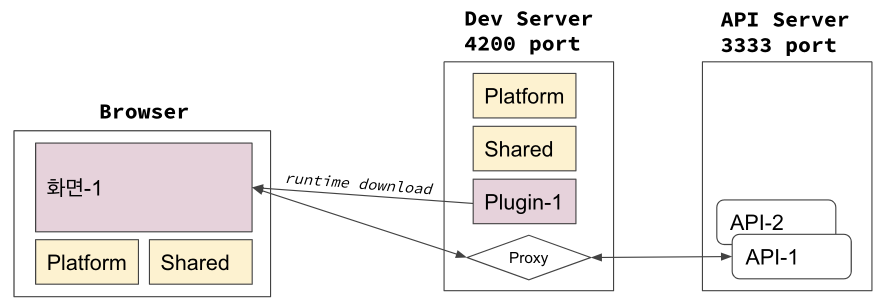 - 화면-1에 대한 요청을 Proxy Server에 하면 Url context 구분을 통해 Remote Server-1 서비스에 Plugin-1 파일을 요청 처리한다.