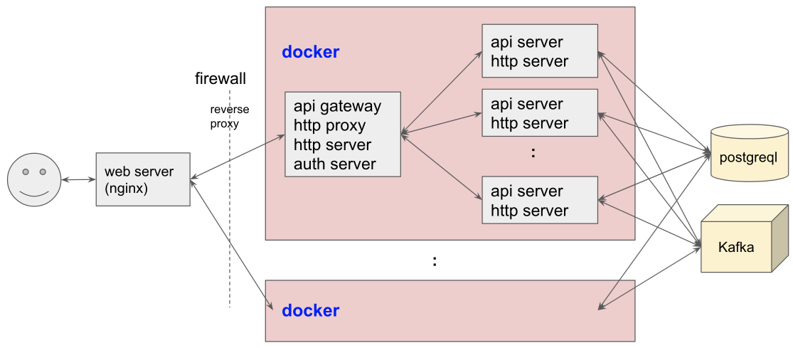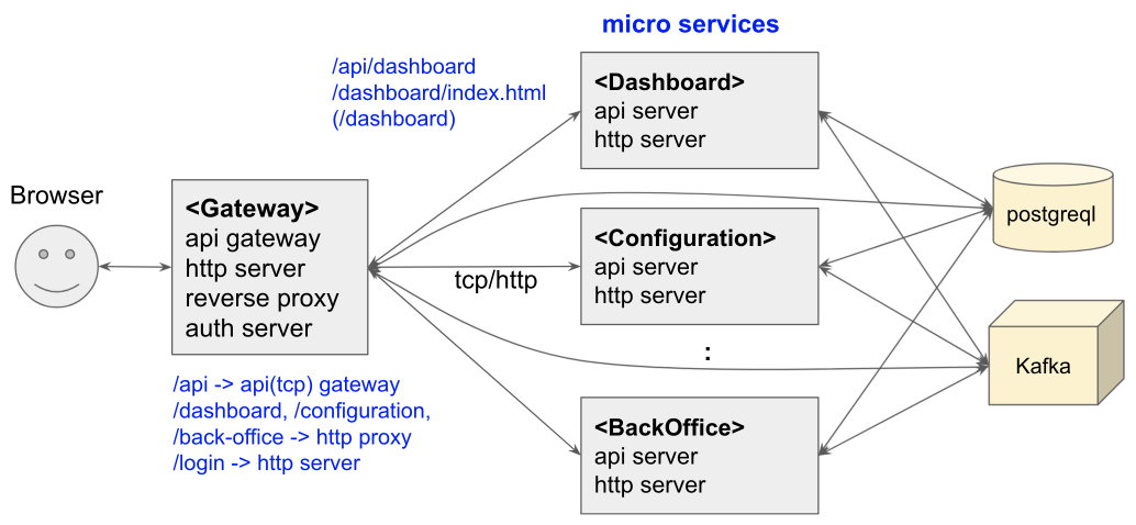 - reverse proxy: micro service에 대한 web bundling file에 대한 reverse proxy 역할을 한다.