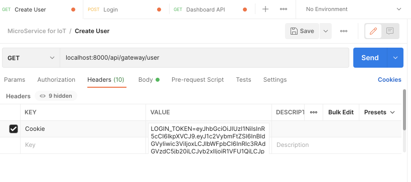 accessTokenCookie를 복사하여 다른 명령 전송시에 Headers에 Cookie를 등록하여 사용한다.