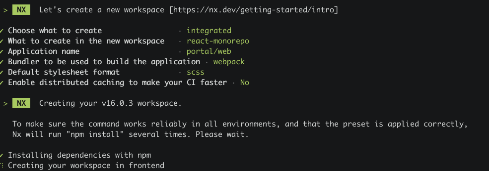 create-nx-workspace 최신으로 frontend 폴더 밑으로 비어있는 apps, libs 환경을 생성한다.