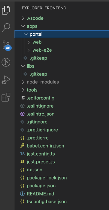 apps/portal/web 이 생성되었다. 사용하지 않는 web-e2e를 정리한다. 별도의 애플리케이션을 생성하려면 workspace.json 파일을 루트 폴더에 생성한다.