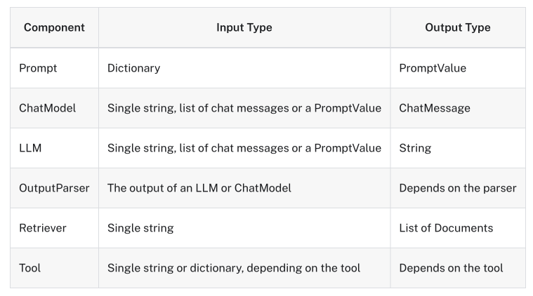 - Prompt, ChatModel, LLM, OutputParser, Retriever, Tool