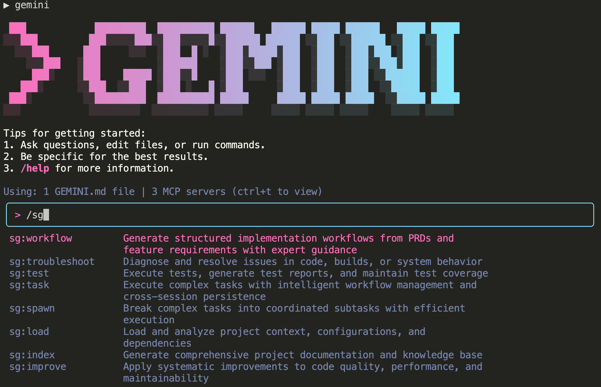 /sg 를 입력하면 이제 SuperGemini 기능을 사용할 수 있다.