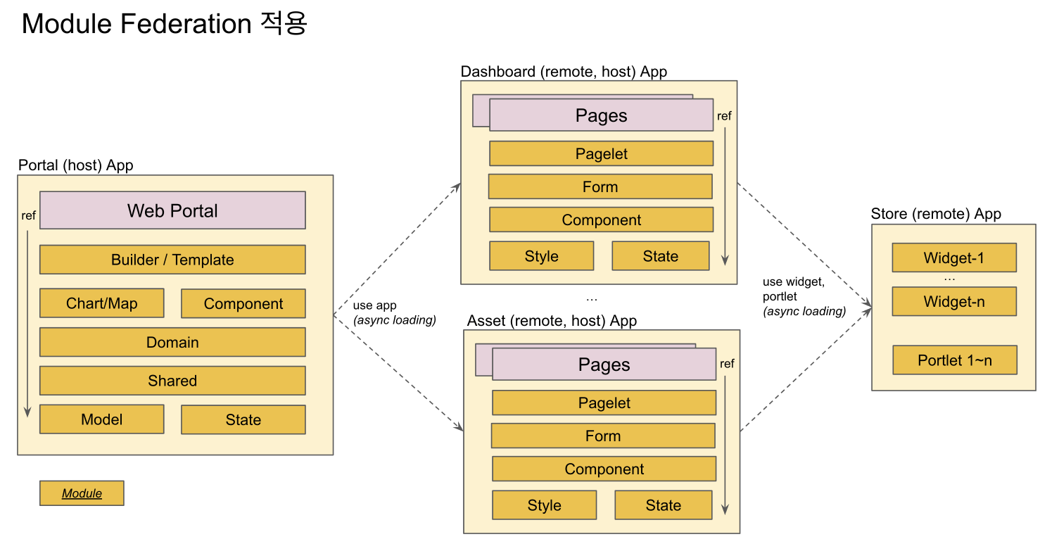 + Host 앱이 되어서 portal의 exposed module을 async loading하여 사용한다.