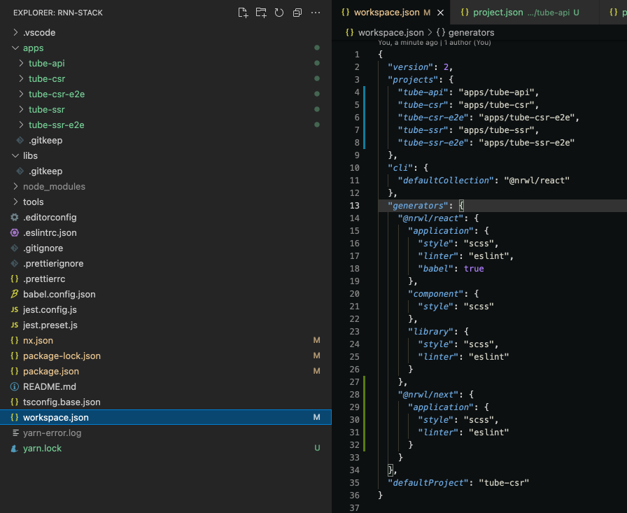 애플리케이션과 라이브러리를 많이 만들다 보면 rnn-stack/workspace.json 파일안에 설정이 계속 추가된다. 가독성을 위하여 애플리케이션(라이브러리 포함) Nx의 환경설정을 프로젝트별 별도 파일로 분리한다. 분리후에는 애플리케이션이나 라이브러리 생성시 자동으로 "project.json" 파일로 분리가 된다.