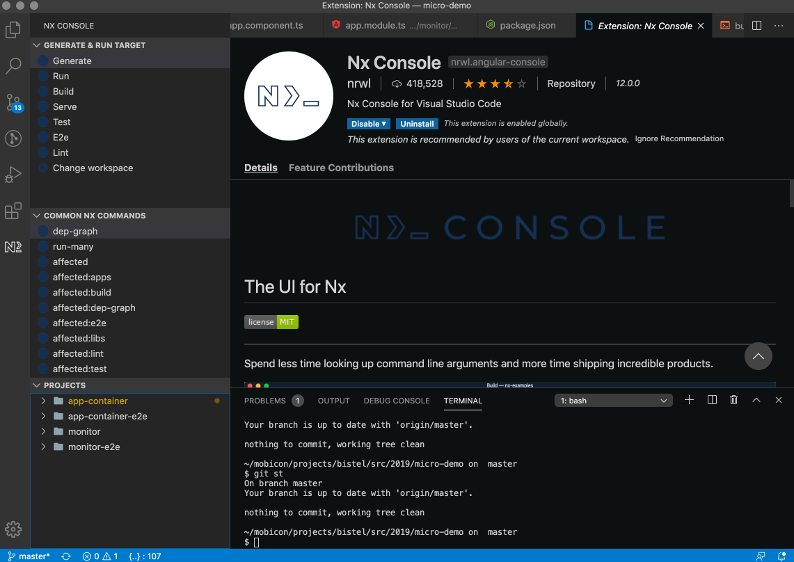 - MS Code Editor의 Plugin으로 "Nx Console"을 설치하면 Editor에서 바로 수행해 볼 수도 있다.