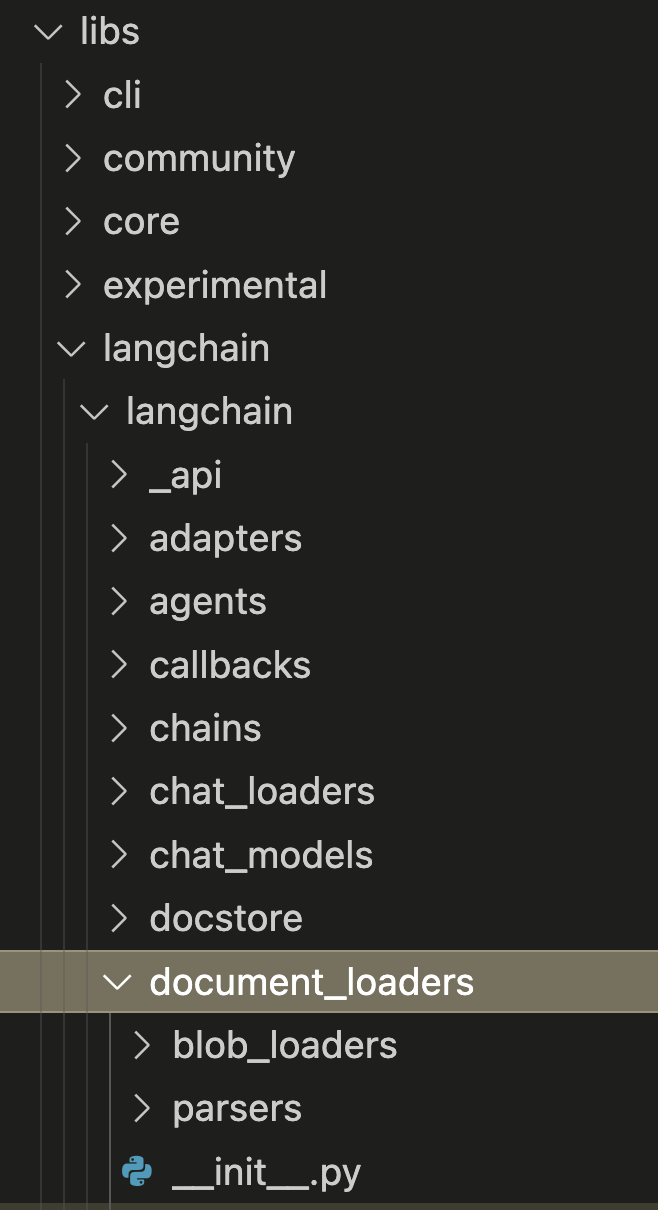 langchain 패키지 소스를 보면 document_loaders 패키지가 존재하고, 대부분 langchain_community 패키지 소스를 re-exporting 하고 있다.